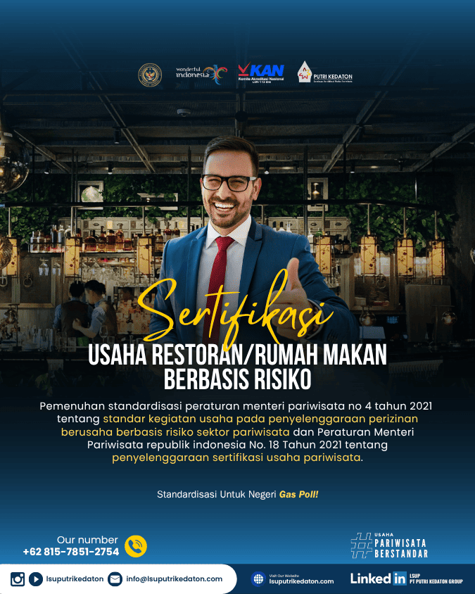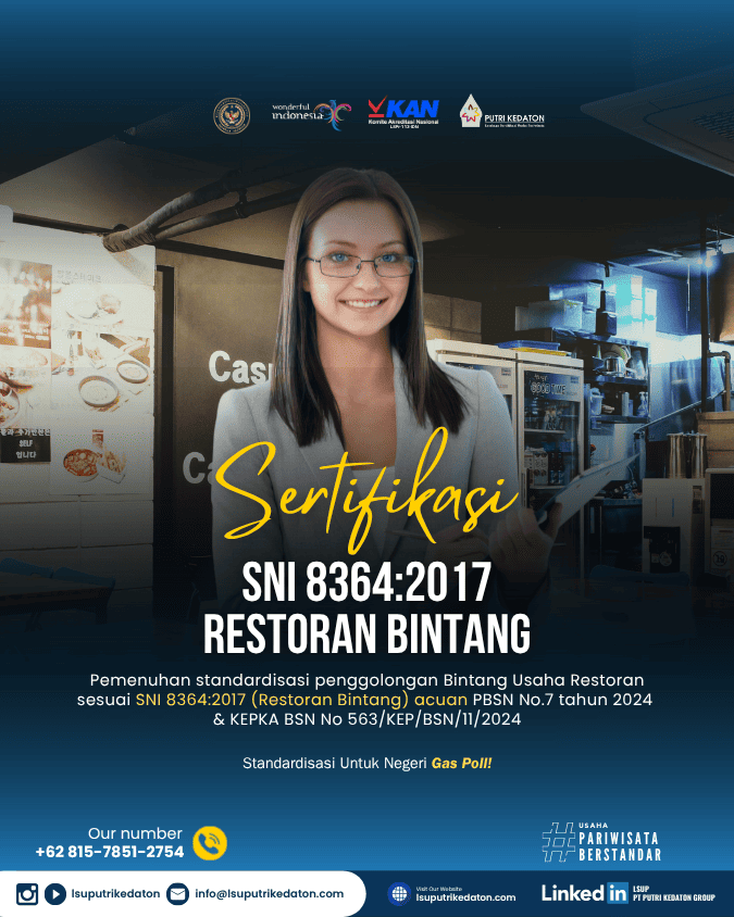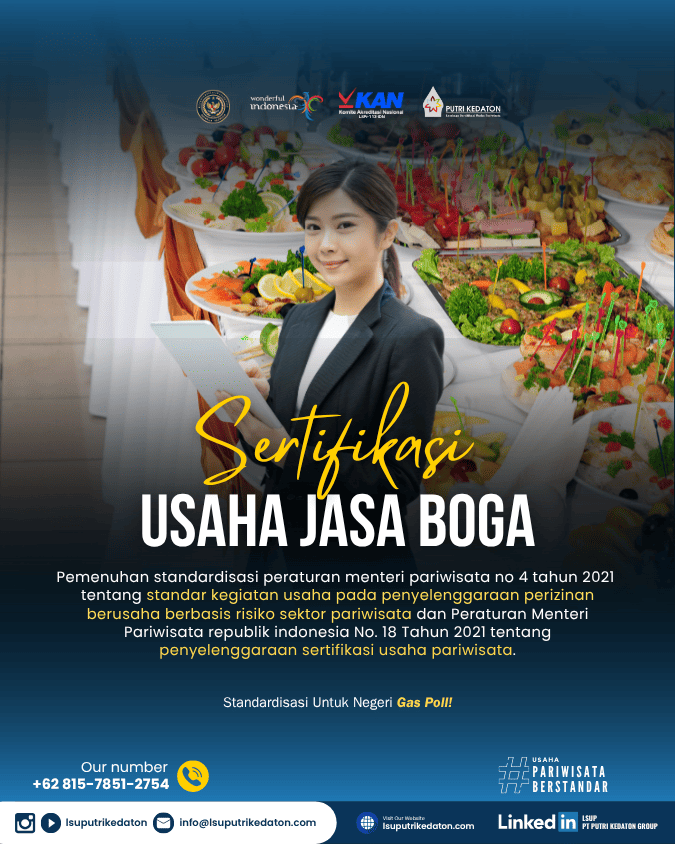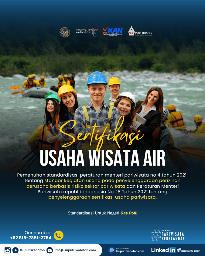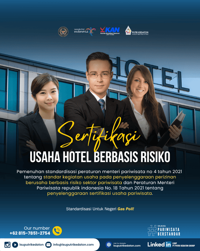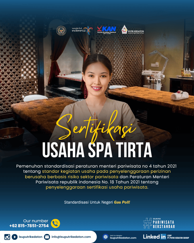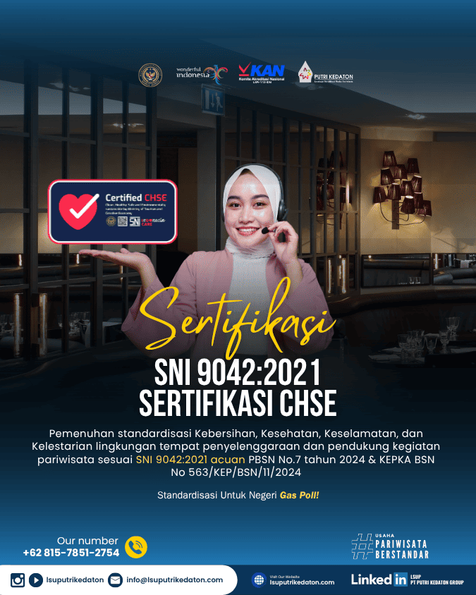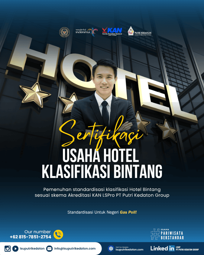 Standardisasi dan Sertifikasi Usaha Sektor Pariwisata bertujuan untuk meningkatkan kualitas pelayanan kepariwisataan dan produktivitas usaha pariwisata serta daya saing industri pariwisata Indonesia. Lembaga Sertifikasi Usaha PT PUTRI KEDATON GROUP atau LSUP PT PUTRI KEDATON GROUP merupakan lembaga mandiri yang telah diakreditasi oleh Komite Akreditasi Nasional (KAN) dan telah ditunjuk serta ditetapkan sebagai Lembaga Sertifikasi Usaha bidang Pariwisata oleh Menteri Pariwisata Republik Indonesia sehingga memiliki kewenangan untuk melaksanakan sertifikasi usaha pariwisata di wilayah NKRI.